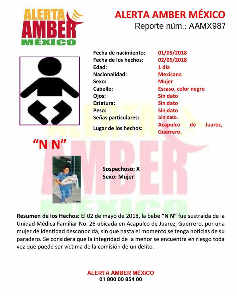 En esa fecha los padres señalaron que una persona del sexo femenino sustrajo a la menor cuando la madre acudió a consulta por un padecimiento.